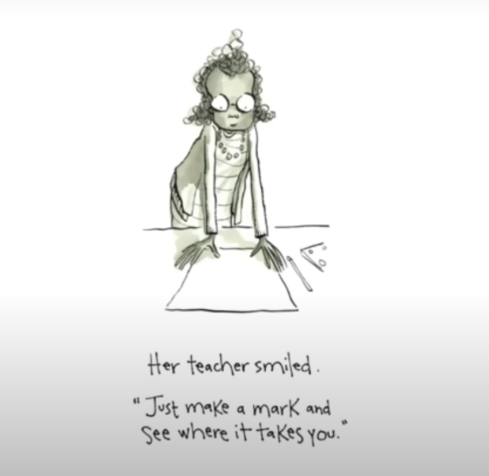 Para comenzar, en The Dot conocemos a Vashti, una niña frustrada por no saber dibujar. Al verla, su maestra de arte le dice una de las frases más icónicas del autor: «Haz solo una marca y mira a dónde te lleva.»