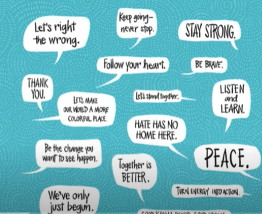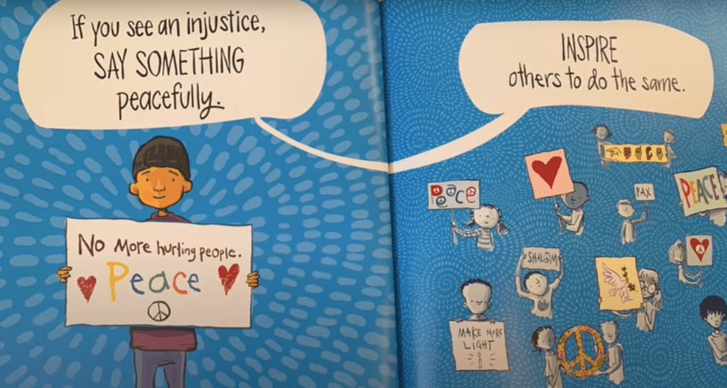 Así como The Dot refuerza la creación y la confianza, Say something! resalta el poder de levantar nuestra voz, no necesariamente hablando o gritando, ya que, como escribe Reynolds «no necesitas ser ruidoso. Las palabras poderosas pueden ser un susurro». Y pueden ser también una pintura, una pancarta, un escrito. Desde el inicio del texto, con la afirmación «El mundo necesita tu voz», se deposita la certeza de que cada niño o niña tiene algo que aportar.