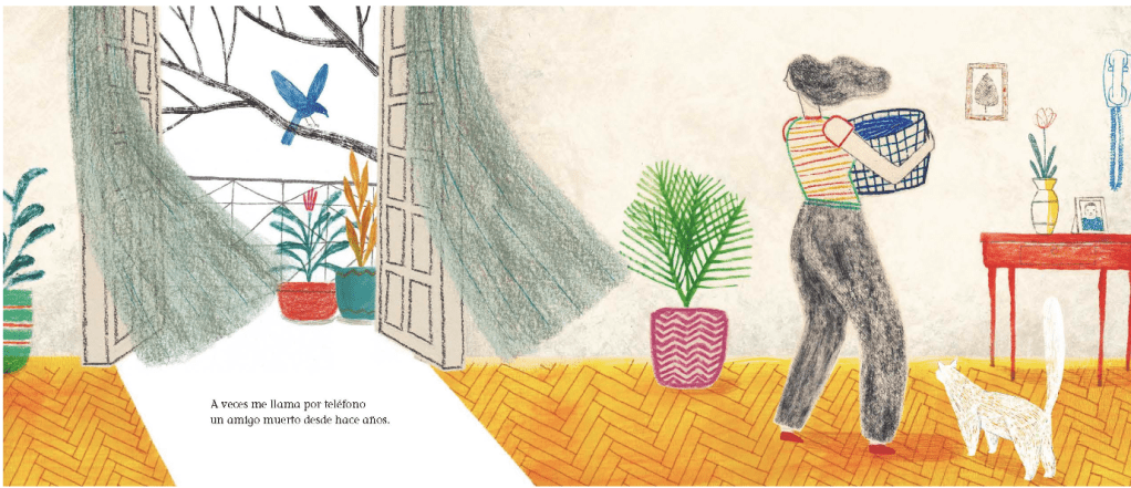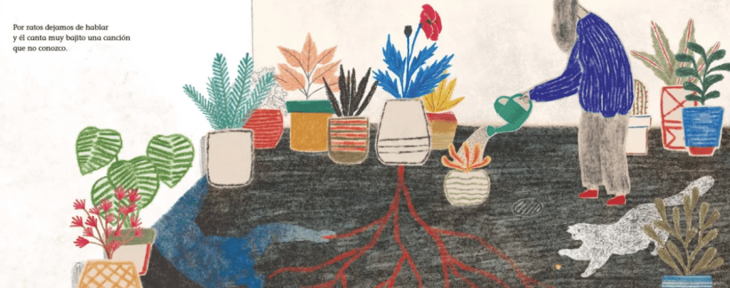Y me parece increíble, y me hace amar aún más los libros, que tres años después, el título de este álbum me ayuda a poner un poco de orden a este duelo tan caótico. La muerte de mi papá me ha llevado a un mundo que no conozco y que, cuando creo que lo estoy entendiendo, algo me sacude y me deja donde empecé: en la incredulidad, en la genuina esperanza de un reencuentro, en la sensación posesiva para que no se me siga escapando, para que no se me olvide nunca, para que nadie me lo quite, para que siga teniendo presente su voz y sus abrazos.